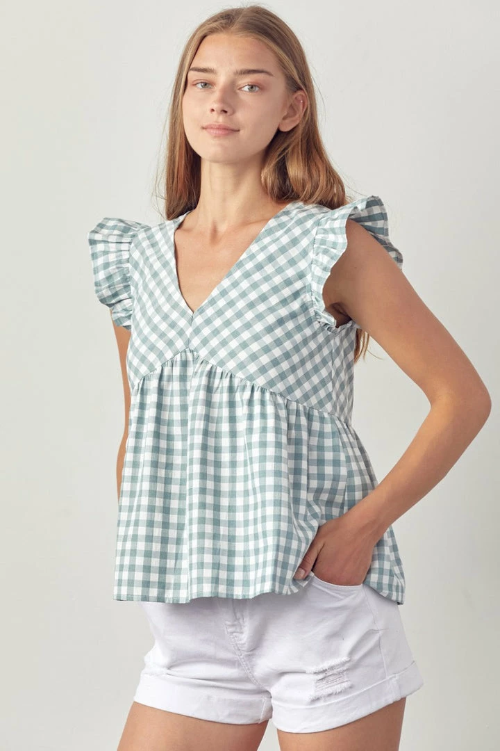 &Merci Women’s Dusty Turquoise Gingham Print Ruffle Sleeve