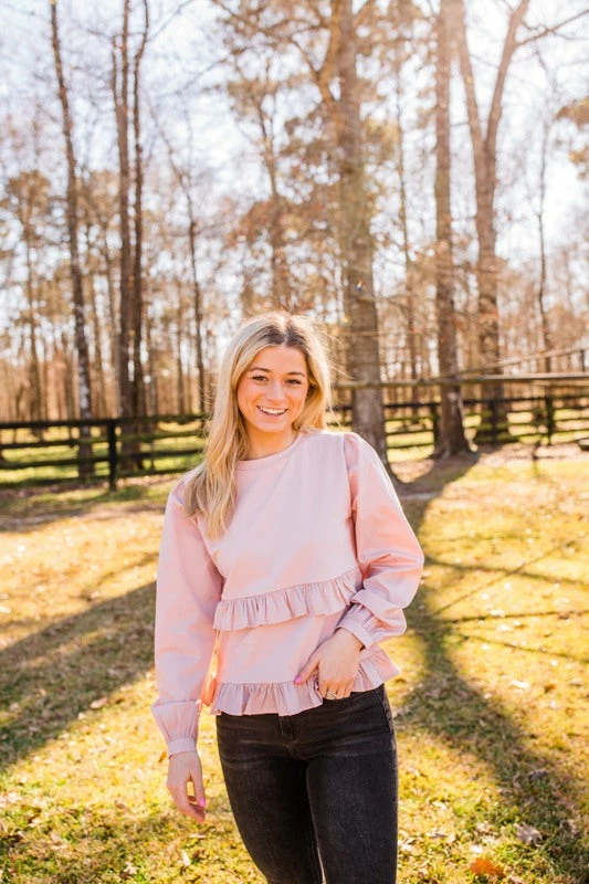 Strut & Bolt Women’s Pale Pink Poplin Ruffle Knit Long Sleeve Tops