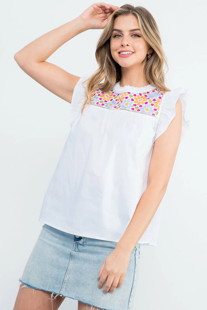 THML Women’s White Embroidered Ruffle Sleeve Poplin Top