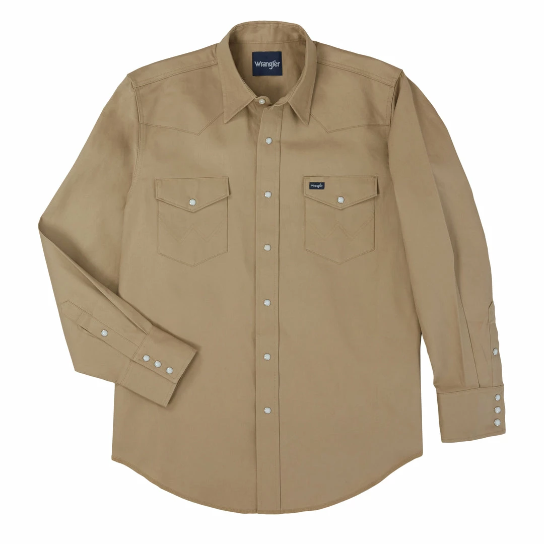 Authentic Cowboy Cut® Work Western Shirt. Long Sleeves. Spread Collar. Authentic Western Front and Back Yokes. Two Authentic Western Spade Flap Snap Pockets with Snap Closure. Wrangler® Logo Ribbon Label on Left Pocket. Pencil Slot at Left Pocket Flap. Wrangler® “W” Decorative Logo Stitch on Pockets. Authentic Western Three Snap Cuffs with One Snap Sleeve Placket.